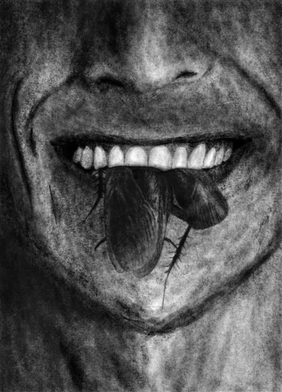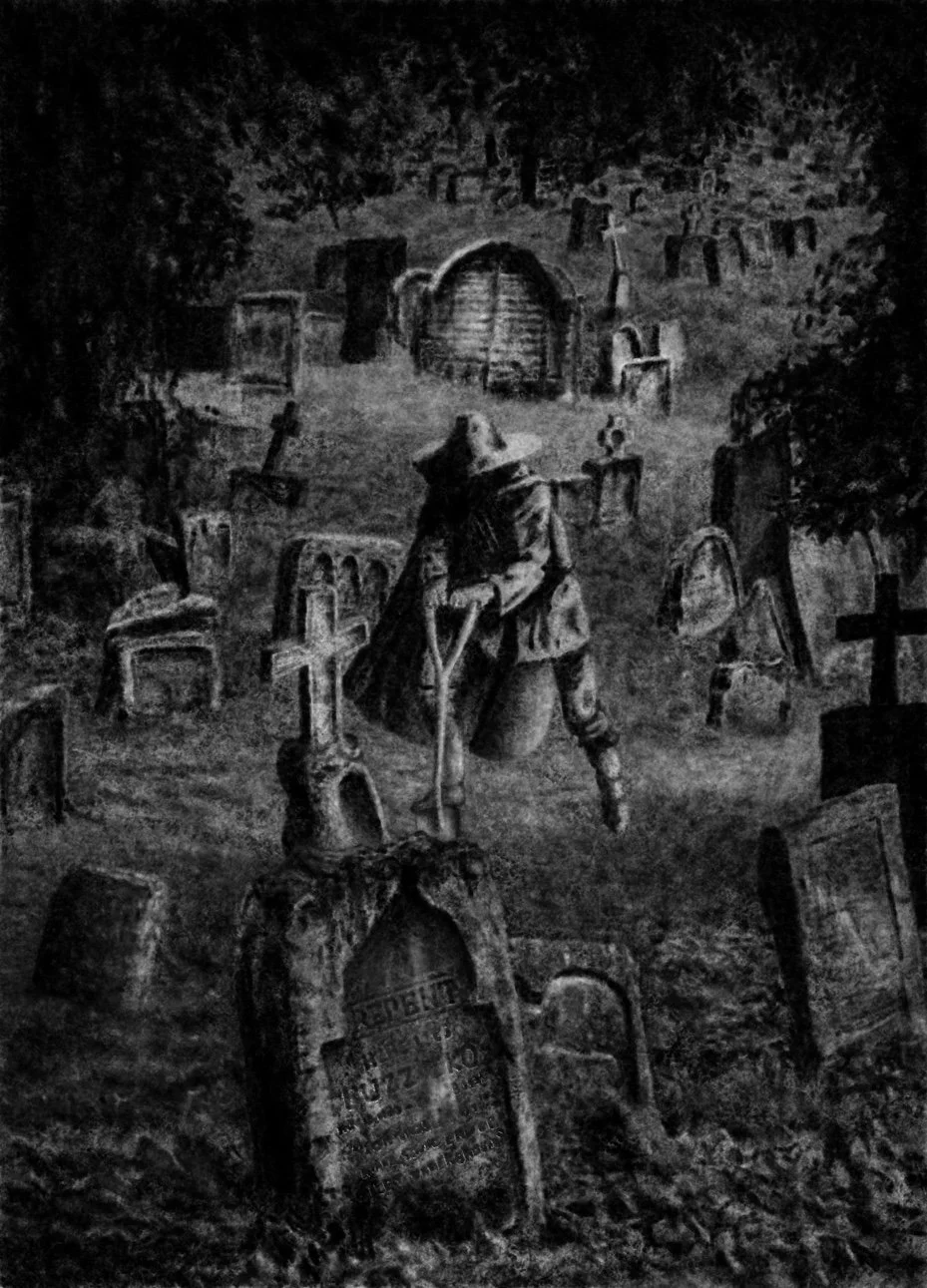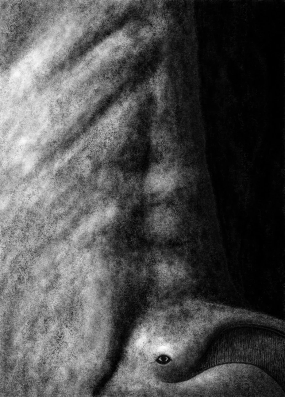 The five black-and-white digital charcoal drawings were commissioned for the horror video game Repent.